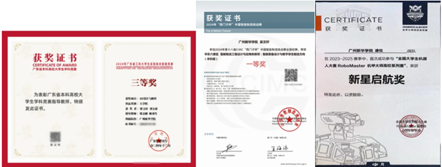 梁文轩同样在学科竞赛中表现突出,斩获2024年“西门子杯”中国智能制造挑战赛广东省一等奖、2024年广东省3D设计与制作大赛广东省三等奖、Robotmaster高校机甲大师赛新星启航奖,竞赛经历全面提升专业素养。