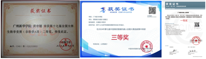 黄育锶在校期间成果丰硕,荣获第十七届全国大学生数学竞赛广东省二等奖、第十八届“西门子杯”智能制造挑战赛广东省一等奖、第七届中国高校智能机器人创意大赛初赛三等奖,以赛促学夯实专业能力。